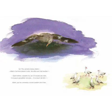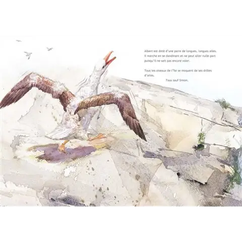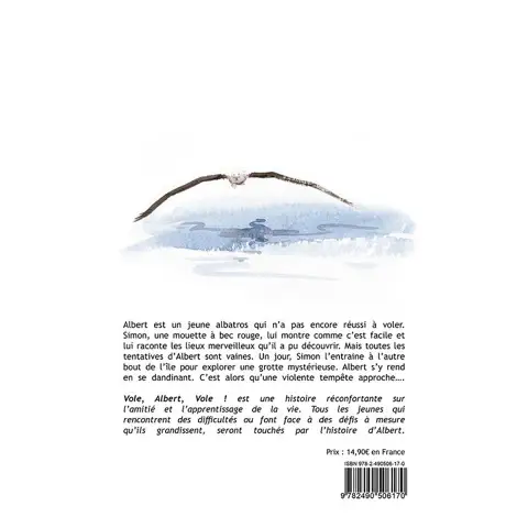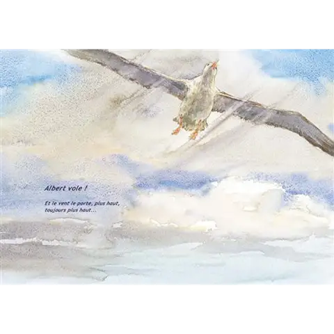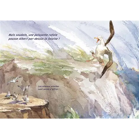 Albert est un jeune albatros qui n’a pas encore réussi à voler. Simon, son ami, une mouette à bec rouge, lui raconte les endroits merveilleux qu’il a pu découvrir en volant. Mais toutes les tentatives d’Albert sont vaines. Un jour, Simon l’entraine à l’autre bout de son île pour explorer une grotte mystérieuse. Albert s’y rend, clopin-clopant. C’est alors qu’une violente tempête approche ?
